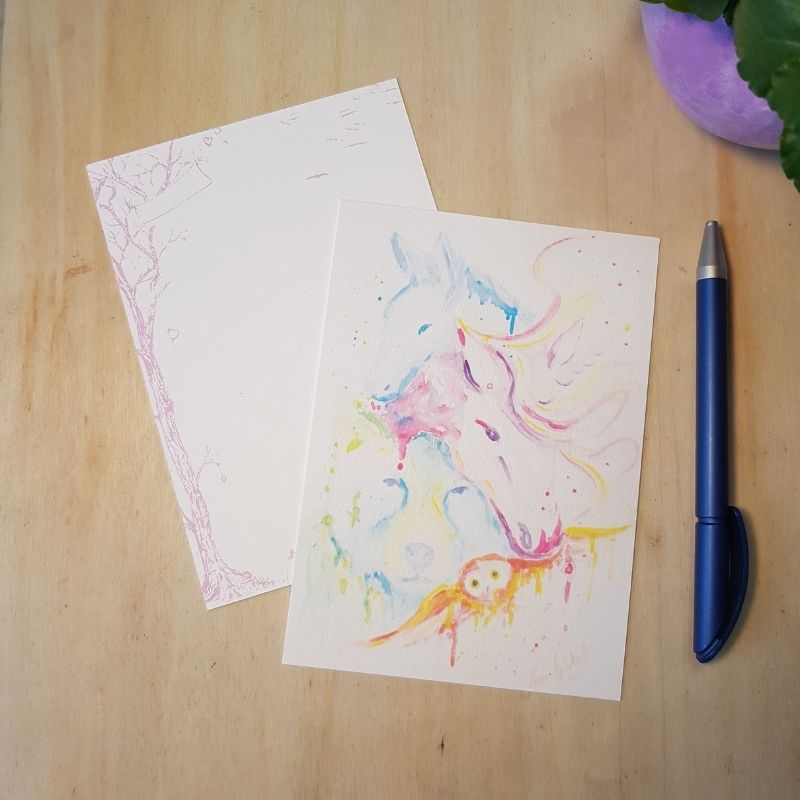 Die Postkarte „Krafttiere“ zeigt einen Esel, ein Einhorn, einen Bären und einen Waldkauz / Eule. Es zeigt das feine Leuten der Spirits in all ihren Farben.